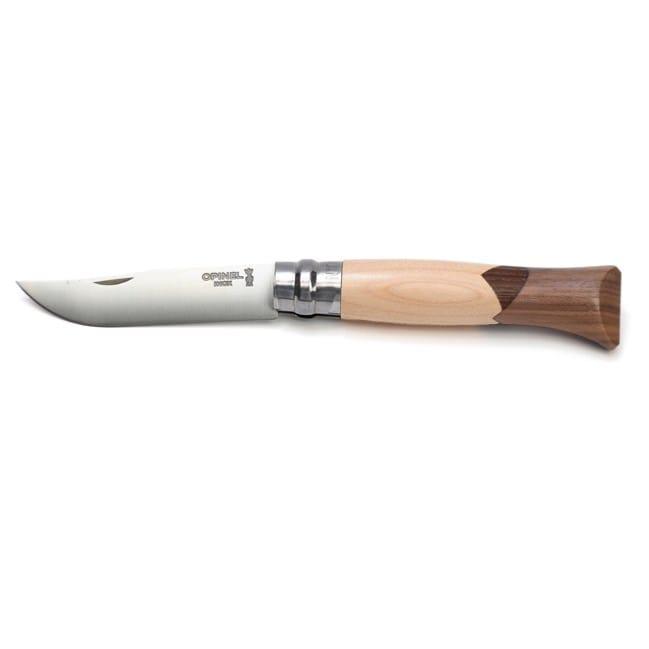 Tiene una hoja de 9 cm, es de acero inoxidable y el mango está hecho ensamblando 3 maderas diferentes de origen francés: arce sicómoro, fresno termotratado y nogal negro.